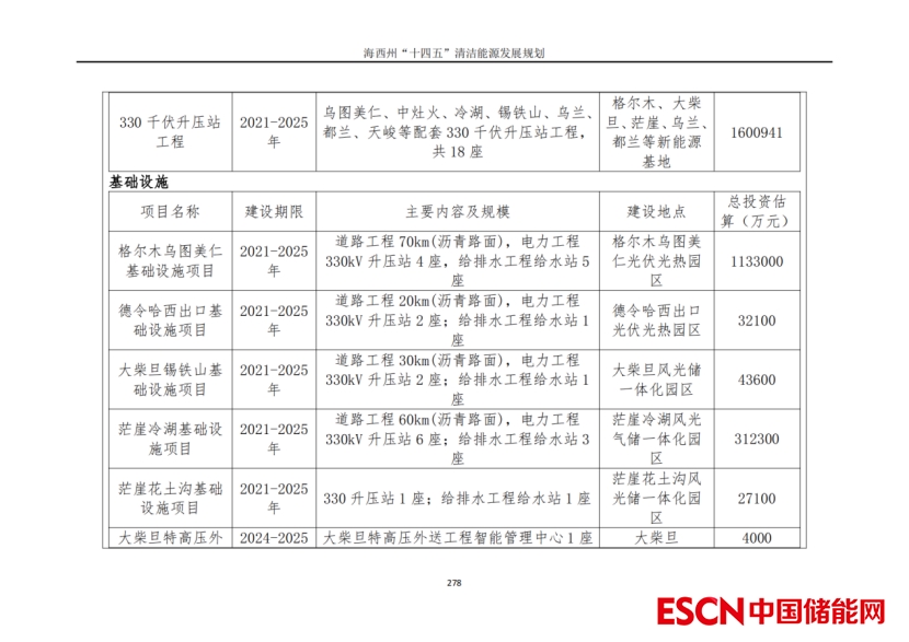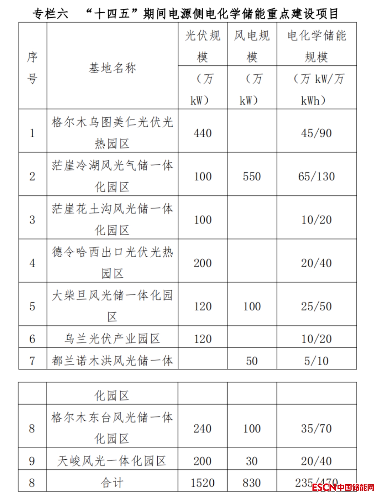 儲能方面:“十四五”期間,電化學(xué)儲能擬重點布局在海西州可再生能源千萬千瓦級外送基地,與光伏、風(fēng)電項目配套建設(shè),擬重點布局在烏圖美仁光伏光熱園區(qū)、大柴旦風(fēng)光儲一體化園區(qū)、茫崖冷湖風(fēng)光氣儲一體化園區(qū)、德令哈西出口光伏光熱園區(qū)、烏蘭光伏產(chǎn)業(yè)園區(qū)、都蘭諾木洪風(fēng)光儲一體化園區(qū)內(nèi),規(guī)劃新建電源側(cè)電化學(xué)儲能規(guī)模為235萬kW/470萬kWh。主要為化學(xué)儲能(鋰電池),配置儲能時長為2h。