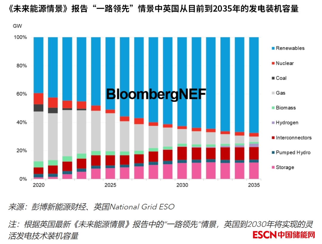 對于其他儲能技術(shù),例如液態(tài)空氣儲能(LAES)和壓縮空氣儲能(CAES)的裝機(jī)容量將從現(xiàn)在的0GW分別躍升至1.8GW (7.3GWh)和2GW (10GWh)。此外,英國National Grid還預(yù)計(jì),車網(wǎng)互動(V2G)容量將達(dá)到2.7GW (12.3GWh),并指出液流電池等其他新興儲能技術(shù)也有潛力為上述裝機(jī)容量做出部分貢獻(xiàn),但目前由于缺乏運(yùn)營數(shù)據(jù)而未對這些儲能系統(tǒng)建模。