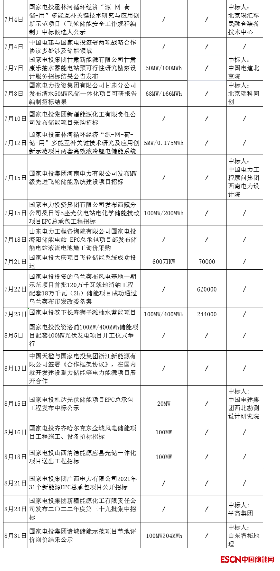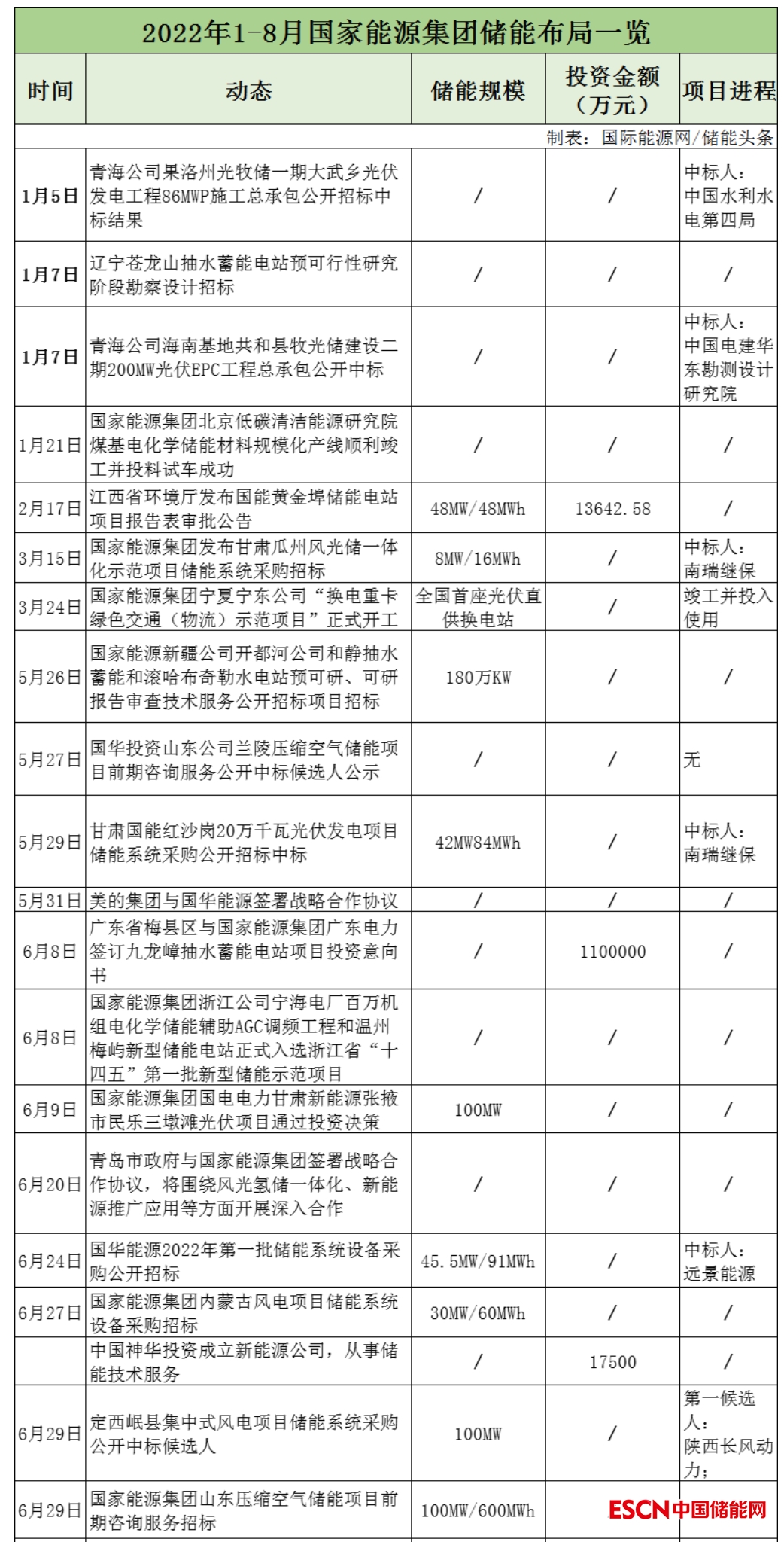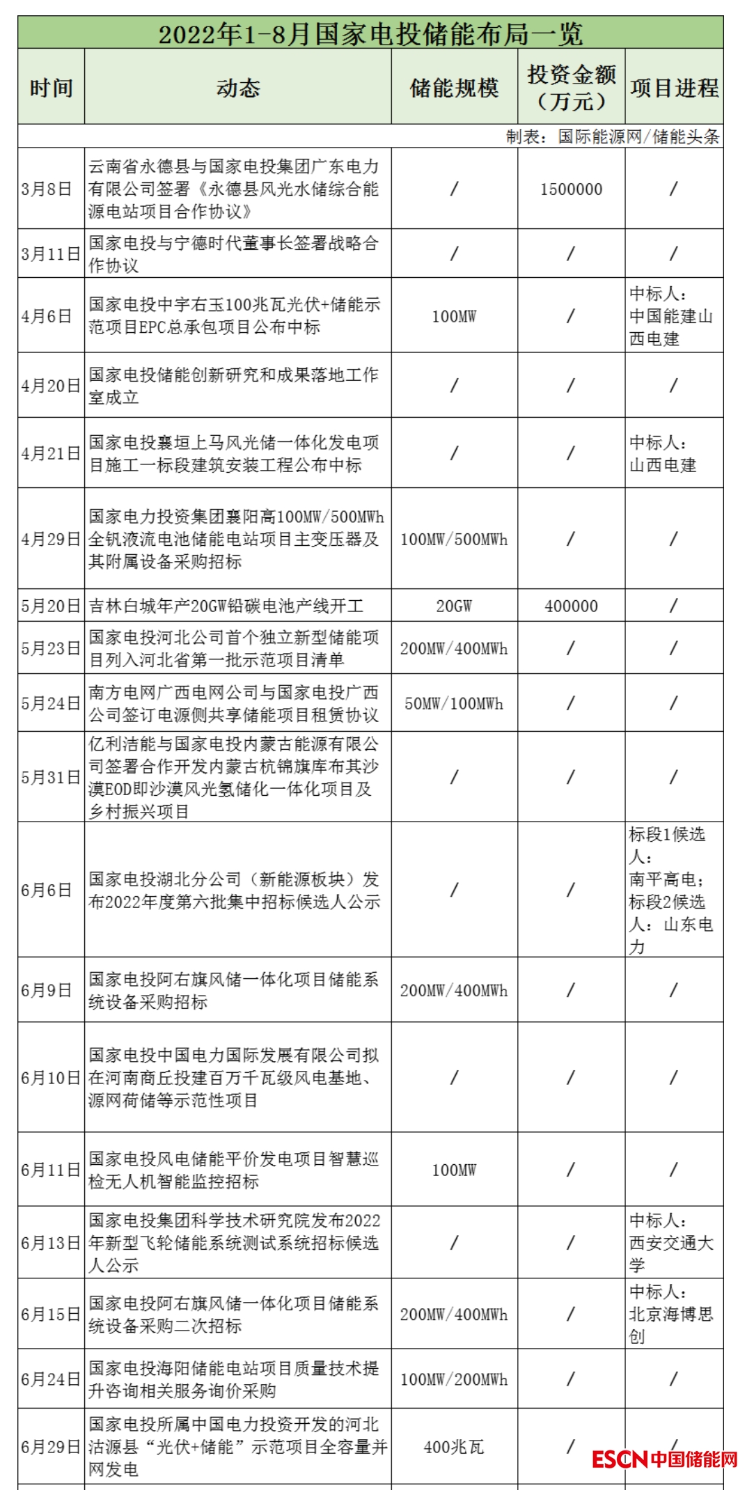 據(jù)不完全統(tǒng)計,2022年1-8月,國家電投與寧德時代、中國電建、中國天楹等簽訂合作協(xié)議,圍繞儲能材料、風光氫儲、重力儲能等方面進行合作。儲能項目招標26個,涉及飛輪儲能、液流電池、鉛炭電池、抽水蓄能及智慧新能源等方面。