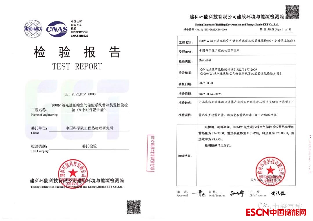 中國儲能網(wǎng)訊:近日,中國科學院工程熱物理所在大規(guī)模先進壓縮空氣儲能示范系統(tǒng)研發(fā)方面取得重要進展,河北省張家口國際首套100MW級先進壓縮空氣儲能示范系統(tǒng)蓄熱裝置通過具有CNAS資質(zhì)的第三方測試,測試結(jié)果為蓄熱量達374.7 GJ,保溫8小時蓄熱效率為98.95%,保溫16小時蓄熱效率為98.73%,為目前壓縮空氣儲能蓄熱裝置效率最高記錄,達到國際領(lǐng)先水平。