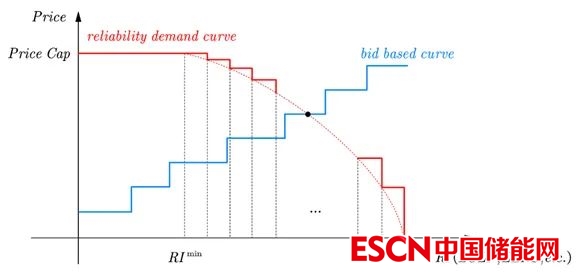 (1)可靠性容量市場:市場組織者根據(jù)未來西北區(qū)域可靠性要求構(gòu)建可靠性需求曲線,曲線形狀如圖9中紅線所示;根據(jù)各機(jī)組上報(bào)容量與價(jià)格,形成可靠性容量報(bào)價(jià)曲線,如圖中藍(lán)線所示。市場組織者組織容量市場統(tǒng)一拍賣,集中出清,以報(bào)價(jià)曲線與可靠性容量需求曲線的交點(diǎn)為可靠性容量市場均衡點(diǎn),并以此為邊際價(jià)格進(jìn)行結(jié)算。
