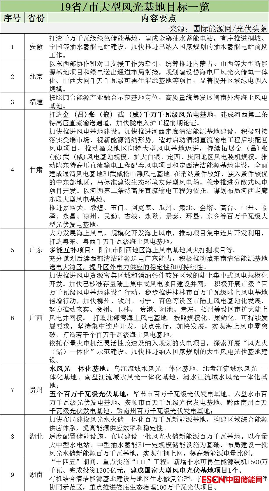 大型風光基地時代已到來,各地也在出臺的“十四五”能源發(fā)展規(guī)劃的文件中明確支持。據(jù)國際能源網(wǎng)/光伏頭條(PV-2005)不完全統(tǒng)計,目前已有安徽、北京、福建、甘肅、廣東、廣西、貴州、湖北、湖南、吉林、江蘇、遼寧、內(nèi)蒙古、寧夏、青海、山東、山西、天津、浙江19省/市明確提出風光大基地的建設目標以及相關規(guī)劃。