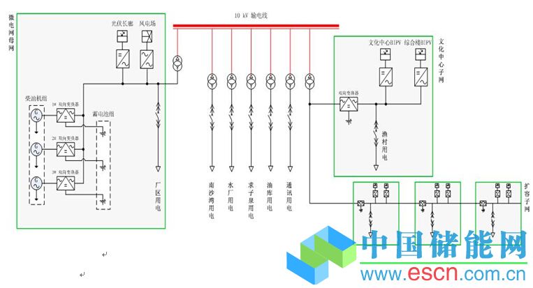 整個(gè)微電網(wǎng)綜合系統(tǒng)主要由微電網(wǎng)母網(wǎng)、文化中心子微網(wǎng)、擴(kuò)容子網(wǎng)等組成。