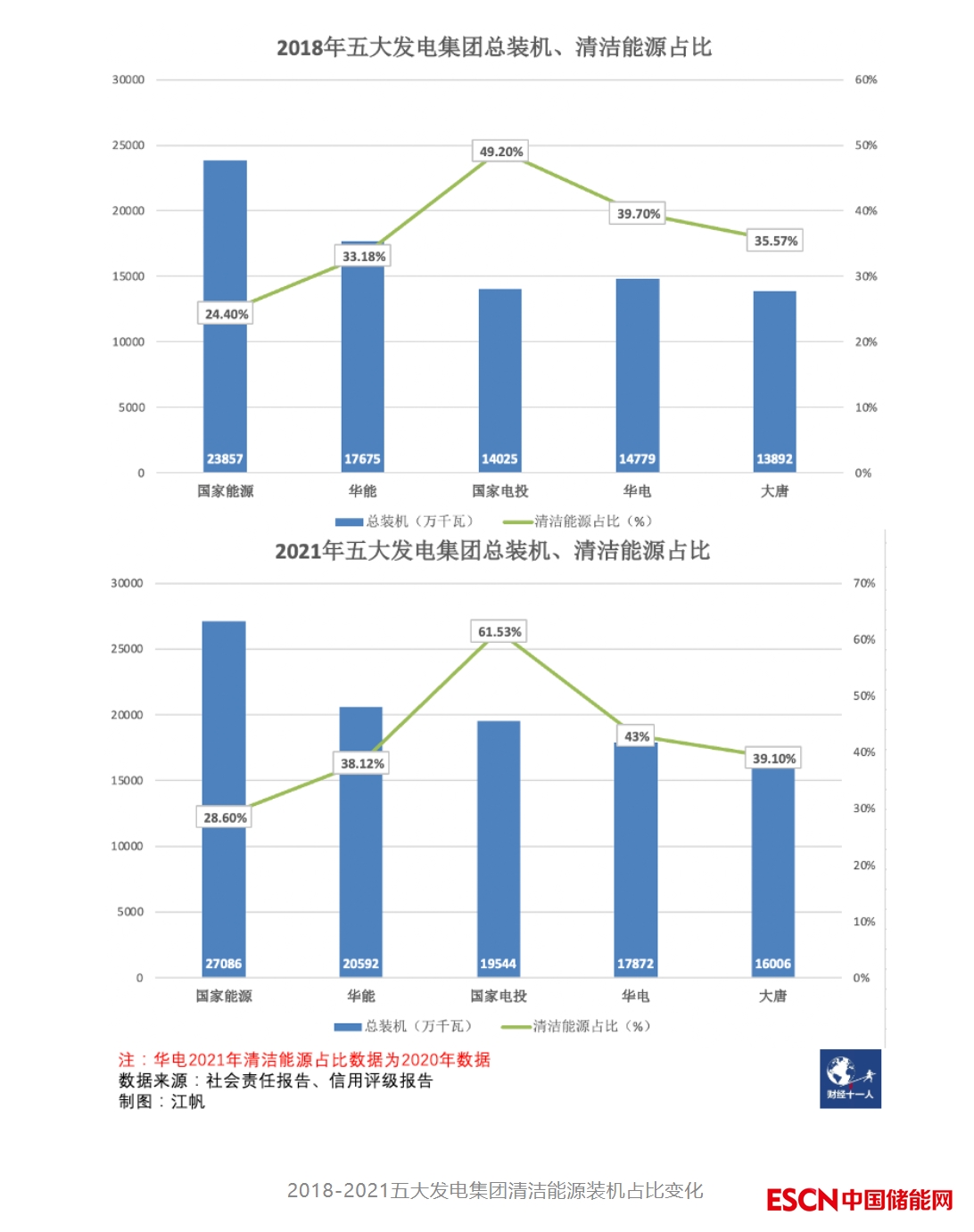 4年后,華能的清潔能源裝機(jī)比例從2018年的33%提高至接近40%,裝機(jī)量達(dá)到8298萬(wàn)千瓦,拉近了與其他發(fā)電央企的差距。