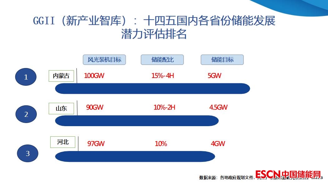 這組數(shù)據(jù)是新產(chǎn)業(yè)智庫(GGII)3月份的數(shù)據(jù),“十四五”國內(nèi)各省份儲能發(fā)展?jié)摿υu估排名,內(nèi)蒙古是第一,儲能的配比是15%,目標(biāo)是5GW。去年8月27號,內(nèi)蒙古自治區(qū)文件要求化學(xué)儲能容量不低于項(xiàng)目總裝機(jī)15%、2小時(shí),這是保障性的。2022年政府最新文件,市場性的并網(wǎng)更加細(xì)化了,提到15%和4小時(shí)。這也是一幅地圖,中央出的文件,“十四五”期間沙漠戈壁大型的基地,都是在西部的,從西部距離北京最近,離中原地區(qū)最近就是內(nèi)蒙古,而且第一批大基地就是1000萬到1300萬,第二批大基地已基本落實(shí),落到三峽、華能、內(nèi)蒙古能建等大型企業(yè),由幾個(gè)企業(yè)共同開發(fā),未來新能源的開發(fā)市場特別大,初步預(yù)估,未來拉動產(chǎn)業(yè)鏈投資約4萬億左右。