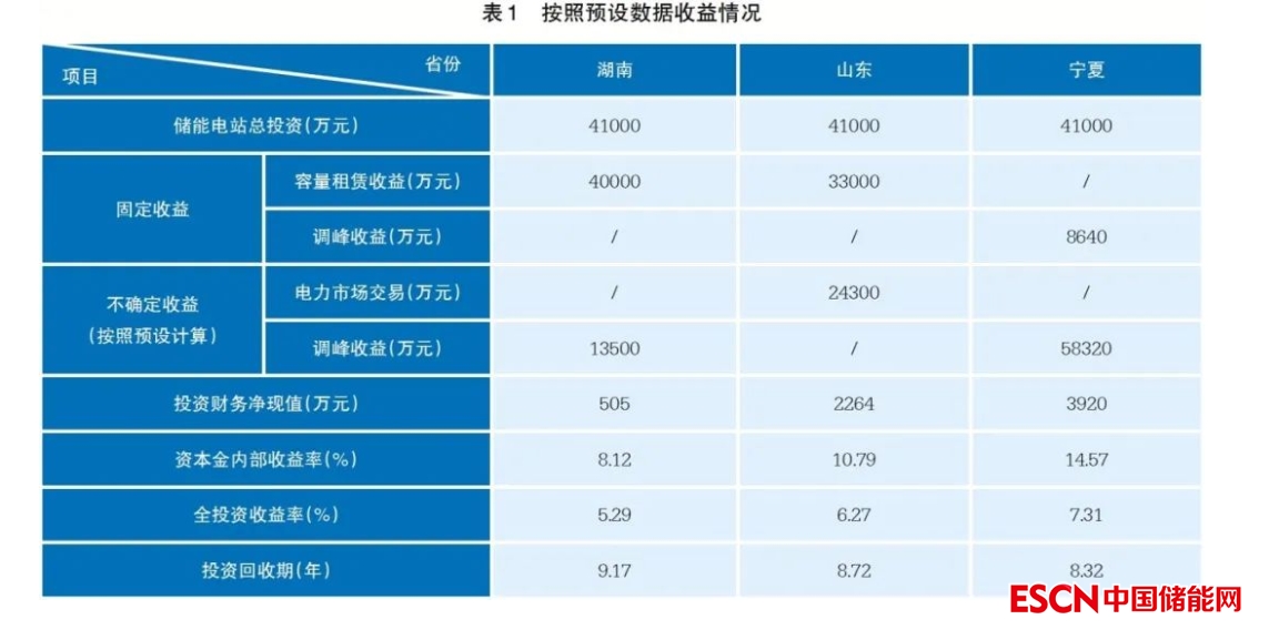 對三省不確定收益預設補償金額和調用次數(shù),湖南輔助服務調峰價格在250元/兆瓦時,調用次數(shù)為年300次;山東電力市場交易放電上限價格0.5元/千瓦時,充電下限價格0.2元/千瓦時,年充放電次數(shù)600次;寧夏輔助服務調峰補償價格0.6元/千瓦時,年調用次數(shù)600次,預估收益情況如表1所示。