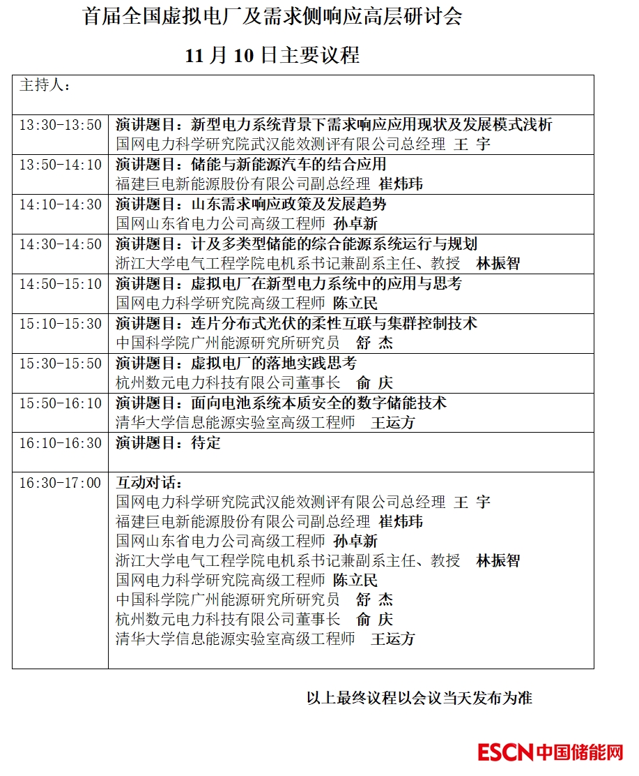 中國儲(chǔ)能網(wǎng)訊:為進(jìn)一步探討新型儲(chǔ)能系統(tǒng)集成與控制技術(shù)取得突破,建立和完善新型儲(chǔ)能裝備制造供應(yīng)鏈,推進(jìn)用戶側(cè)電力資源的智能聚合、互動(dòng)調(diào)控能力,提升項(xiàng)目規(guī)模效益和運(yùn)行經(jīng)濟(jì)性,中國化學(xué)與物理電源行業(yè)協(xié)會(huì)決定于2022年11月9-10日在山東濟(jì)南喜來登酒店召開“首屆中國新型儲(chǔ)能產(chǎn)業(yè)高質(zhì)量發(fā)展大會(huì)暨全國虛擬電廠及需求側(cè)響應(yīng)高層研討會(huì)”,以下為會(huì)議主要議程,供參考。