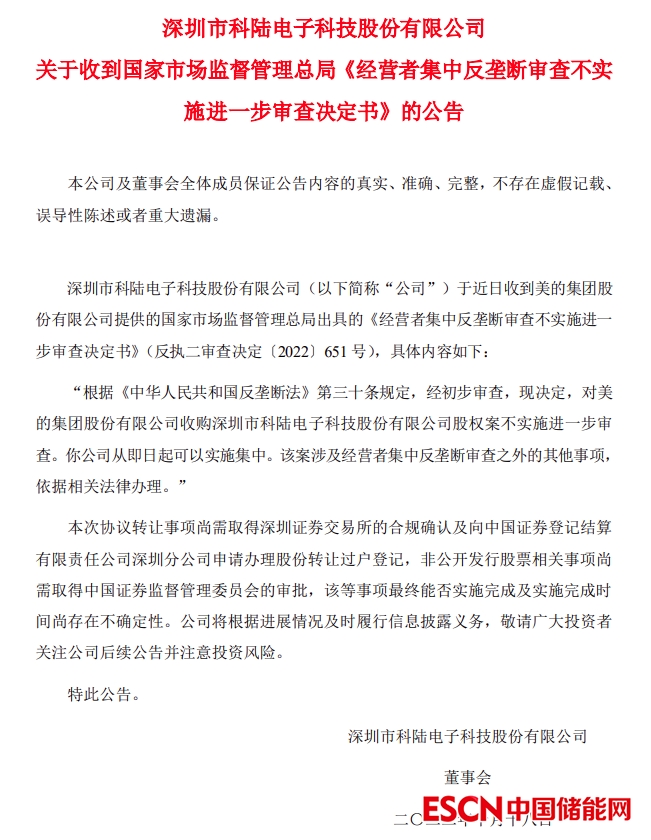 “根據(jù)《中華人民共和國反壟斷法》第三十條規(guī)定,經(jīng)初步審查,現(xiàn)決定,對美的集團(tuán)股份有限公司收購深圳市科陸電子科技股份有限公司股權(quán)案不實(shí)施進(jìn)一步審查。你公司從即日起可以實(shí)施集中。該案涉及經(jīng)營者集中反壟斷審查之外的其他事項,依據(jù)相關(guān)法律辦理?!?