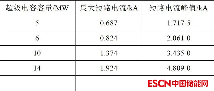 根據(jù)該項目超級電容儲能的配置情況,核算不同超級電容容量工況下的短路電流見表3。