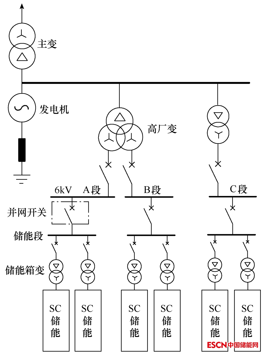 本文以某600MW火電機(jī)組儲能輔助AGC調(diào)頻項目為例進(jìn)行分析。該廠發(fā)變組負(fù)荷段配置情況為:每臺主變低壓側(cè)接一臺雙分裂變壓器(分別接廠用A、B段6kV負(fù)荷)和一臺雙繞組變壓器(接廠用C段6kV負(fù)荷),擬配置超級電容容量為10MW,通過PCS從6kV段母線接入。