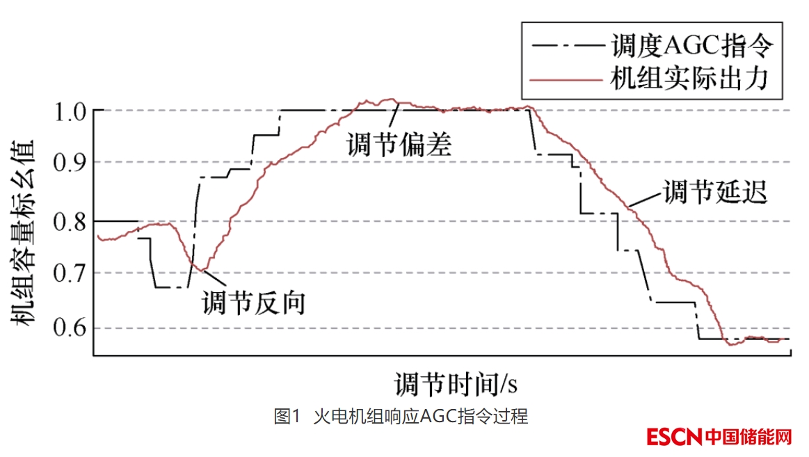 目前,我國電力系統(tǒng)中的調(diào)頻任務(wù)主要由火電、水電等機(jī)組承擔(dān)。以火電機(jī)組為例,由于其轉(zhuǎn)動慣性大、且需要經(jīng)過能源的二次轉(zhuǎn)換,導(dǎo)致機(jī)組調(diào)頻響應(yīng)速度慢、控制精度低?;痣姍C(jī)組響應(yīng)AGC指令過程如圖1所示。隨著電網(wǎng)頻率環(huán)境的惡化,火電機(jī)組的調(diào)頻負(fù)擔(dān)增重,嚴(yán)重影響機(jī)組的運行壽命,因此亟需對現(xiàn)有調(diào)頻方式進(jìn)行改進(jìn)。
