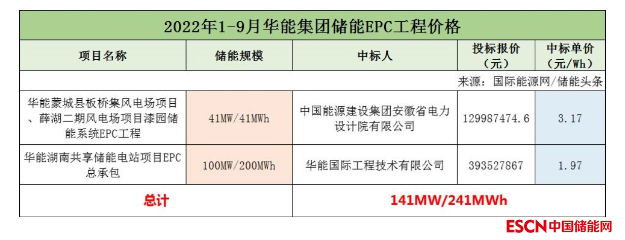 2022年前三季度華能集團(tuán)共有2個(gè)儲(chǔ)能EPC工程項(xiàng)目開標(biāo),項(xiàng)目總規(guī)模為141MW/241MWh。