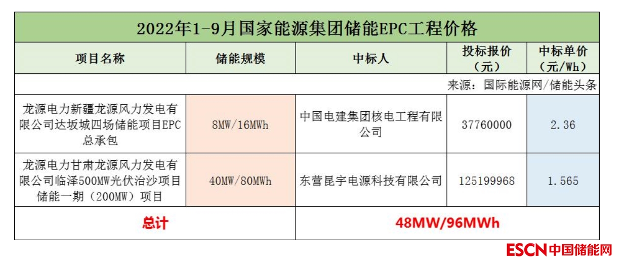 2022年前三季度國家能源集團(tuán)共有2個(gè)儲(chǔ)能EPC工程項(xiàng)目開標(biāo),項(xiàng)目總規(guī)模為48MW/96MWh。