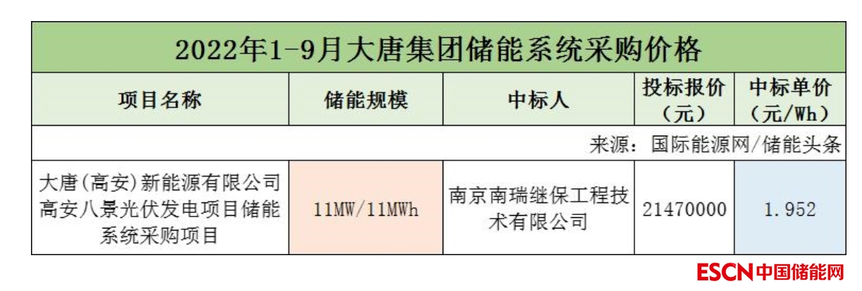 該項(xiàng)目為大唐(高安)新能源有限公司高安八景光伏發(fā)電項(xiàng)目?jī)?chǔ)能系統(tǒng)采購項(xiàng)目,儲(chǔ)能規(guī)模11MW/11MWh,中標(biāo)人為南京南瑞繼保工程技術(shù)有限公司,投標(biāo)報(bào)價(jià)21470000元,折合單價(jià)為1.952元/Wh。