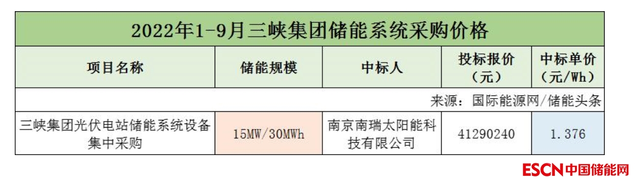 該項(xiàng)目為三峽集團(tuán)光伏電站儲(chǔ)能系統(tǒng)設(shè)備集中采購項(xiàng)目,儲(chǔ)能規(guī)模15MW/30MWh,中標(biāo)人為南京南瑞太陽能科技有限公司,投標(biāo)報(bào)價(jià)41290240元,折合單價(jià)為1.376元/Wh。