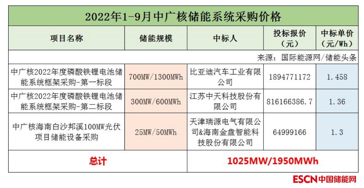 2022年前三季度中廣核共有3個(gè)儲(chǔ)能采購招標(biāo)項(xiàng)目開標(biāo),項(xiàng)目總規(guī)模為1025MW/1950MWh。