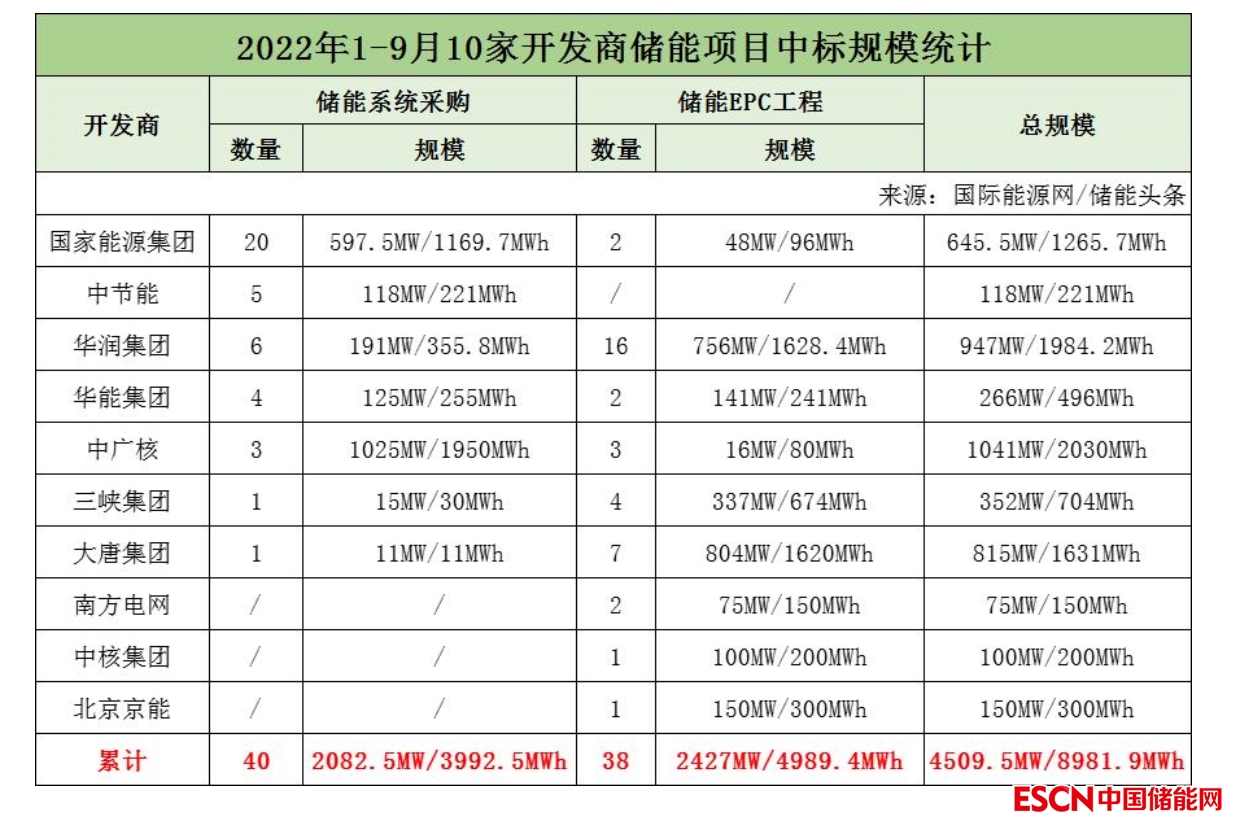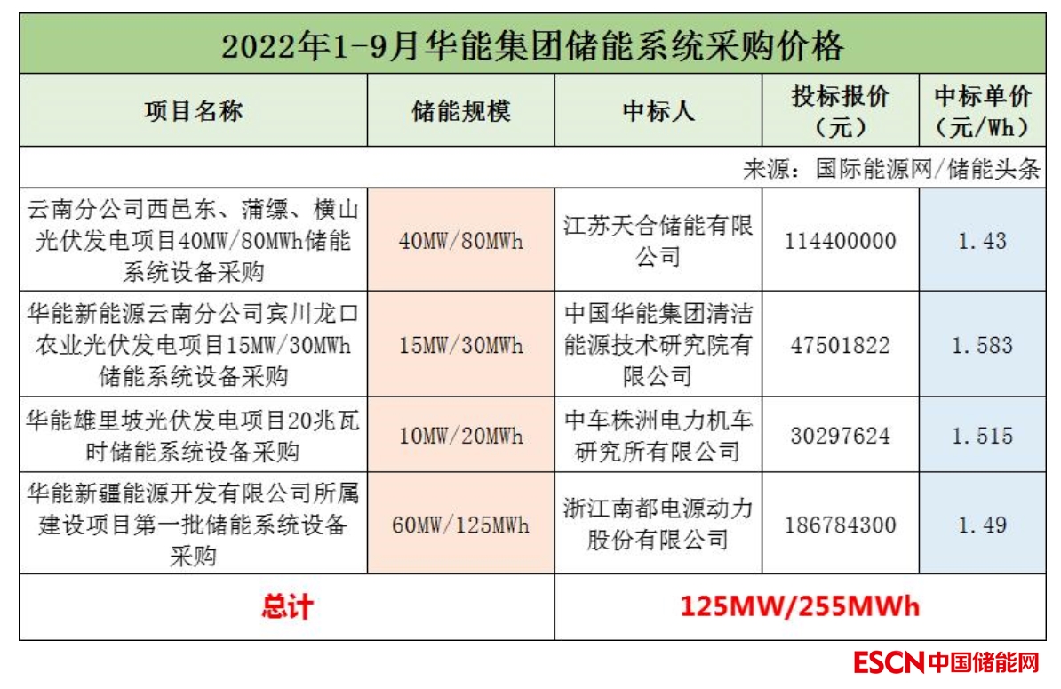 2022年前三季度華能集團(tuán)共有4個(gè)儲(chǔ)能采購招標(biāo)項(xiàng)目開標(biāo),項(xiàng)目總規(guī)模為125MW/255MWh。