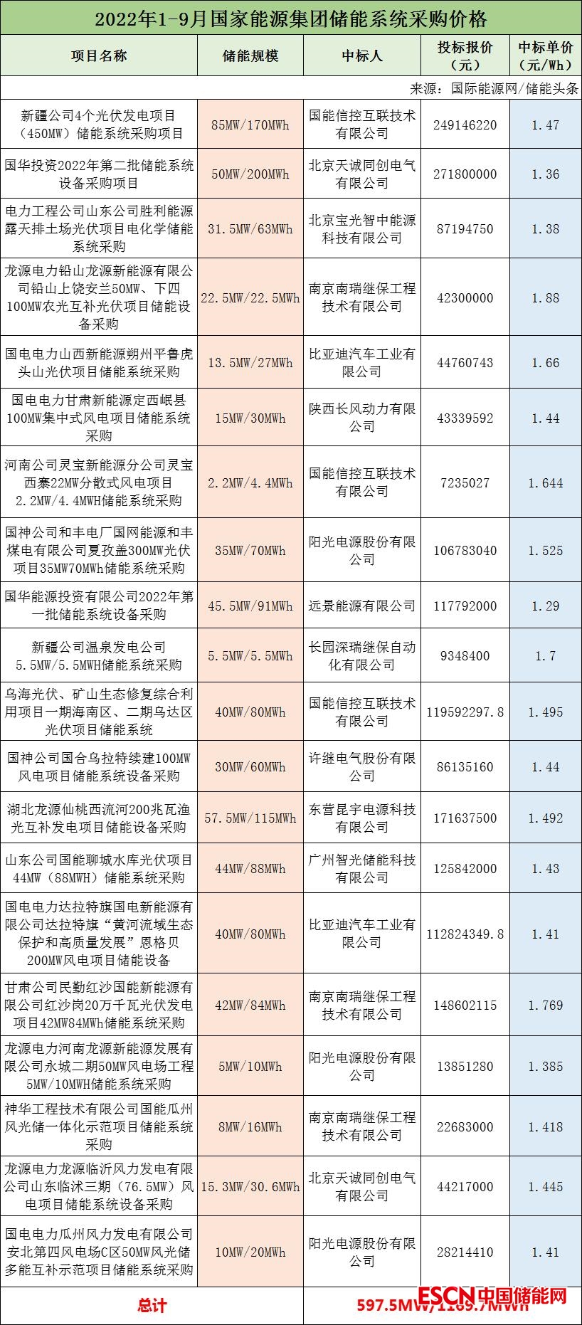 2022年前三季度國家能源集團(tuán)共有20個(gè)儲(chǔ)能采購招標(biāo)項(xiàng)目開標(biāo),項(xiàng)目總規(guī)模為597.5MW/1169.7MWh。