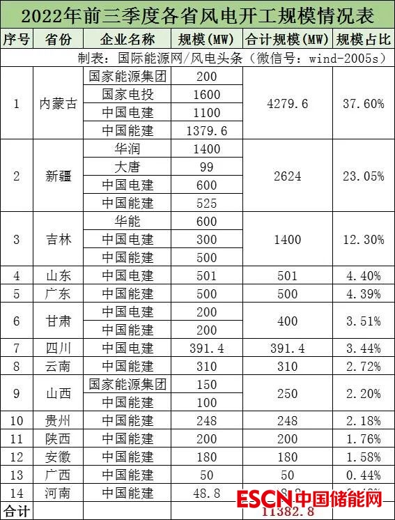 國際能源網(wǎng)/風(fēng)電頭條(微信號:wind-2005s)通過梳理,2022年前三季度開工風(fēng)電項目規(guī)模累計11382.8MW,其中內(nèi)蒙古開工風(fēng)電項目位列第一,規(guī)模達(dá)4279.6MW,新疆位列第二,規(guī)模為2624MW,吉林省位列第三,規(guī)模為1400MW。