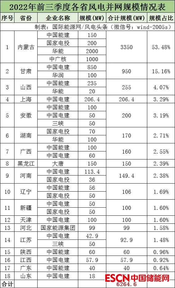 國際能源網(wǎng)/風(fēng)電頭條(微信號:wind-2005s)通過梳理,2022年前三季度并網(wǎng)風(fēng)電項目規(guī)模累計6264.6MW,其中內(nèi)蒙古并網(wǎng)風(fēng)電項目位列第一,規(guī)模達(dá)3350MW,甘肅省位列第二,規(guī)模為950MW,山西省位列第三,規(guī)模為255MW。