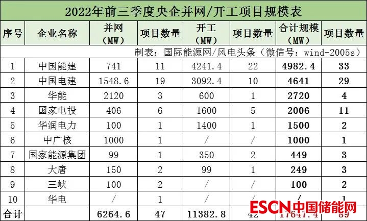 中國儲能網(wǎng)訊:據(jù)國際能源網(wǎng)/風(fēng)電頭條(微信號:wind-2005s)不完全統(tǒng)計,2022年1月1日至9月30日,中國能建、中國電建、華能、國家電投、華潤電力、中廣核、國家能源集團(tuán)、大唐、三峽、華電等10家央企并網(wǎng)及開工風(fēng)電項目累計89個,規(guī)模累計17647.4MW,約17.65GW。其中,并網(wǎng)項目47個,規(guī)模累計6264.6MW,開工項目42個,規(guī)模累計11382.8MW。