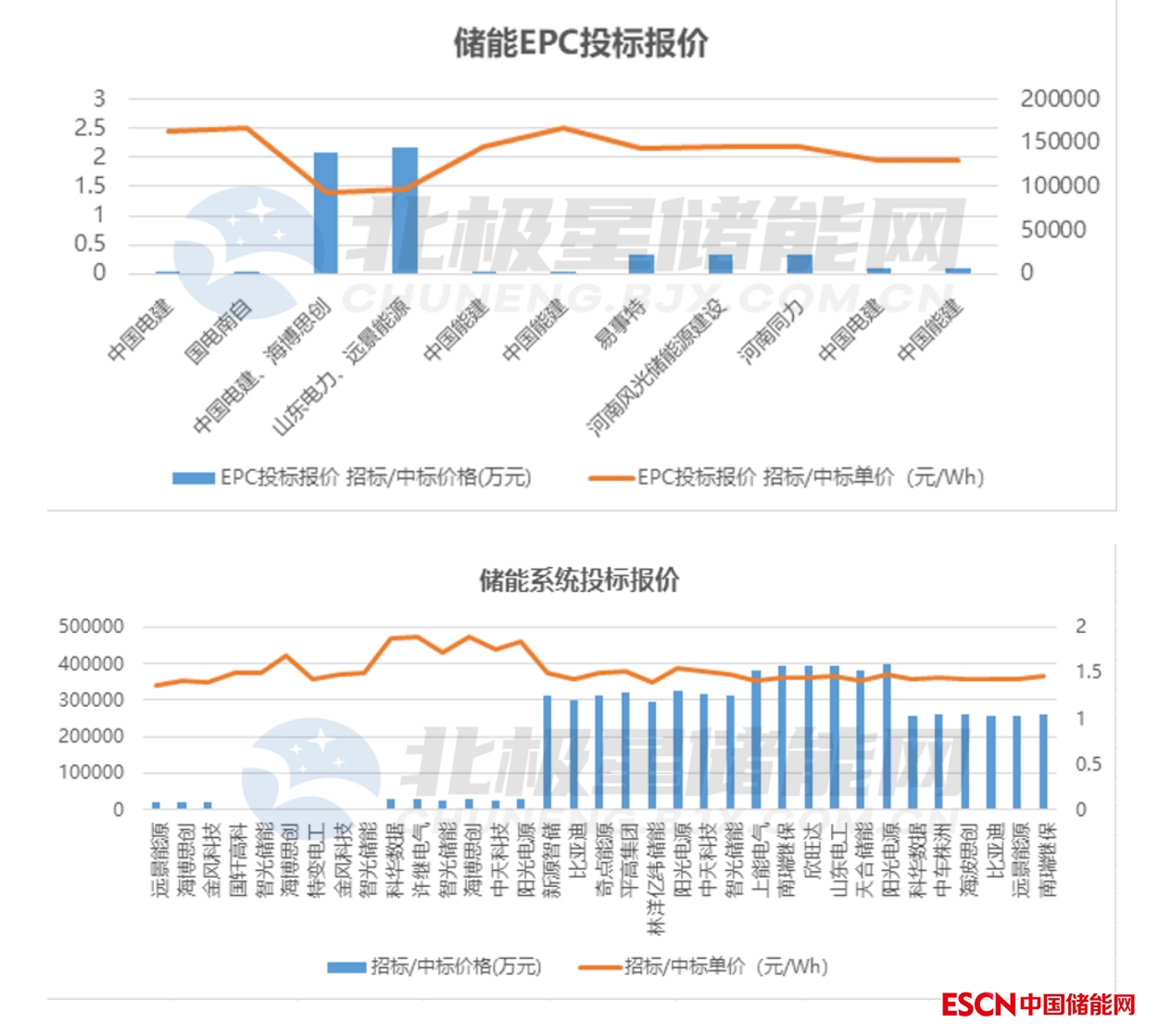 除中核匯能外,中國能建也有一項(xiàng)大項(xiàng)目開標(biāo),采購規(guī)模達(dá)2.25GWh??迫A數(shù)據(jù)、許繼電氣(000400)、智光儲能、海博思創(chuàng)、中天科技(600522)、陽光電源(300274)入選第一標(biāo)段,其中智光儲能報價最低、約為1.72元/Wh。在第二標(biāo)段中,新源智儲、比亞迪(002594)、奇點(diǎn)能源、平高集團(tuán)、林洋億緯儲能、陽光電源、中天科技、智光儲能入選。其中林洋億緯儲能報價最低、為1.40元/Wh。
