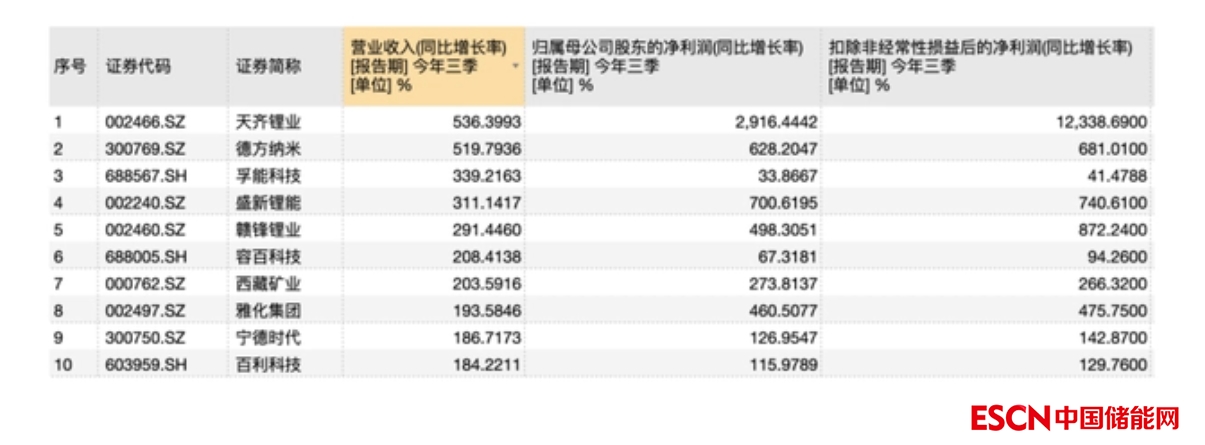 而從單家公司來看,寧德時代與比亞迪當(dāng)之無愧成為“明星公司”。鹽湖股份則憑借高達76.96%的凈資產(chǎn)收益率位列第一名,成為“最會賺錢的公司”。而“最佳進步獎”應(yīng)該頒發(fā)給天齊鋰業(yè)——公司前三季度實現(xiàn)了營業(yè)收入5倍、歸母凈利潤29倍、扣非凈利潤123倍的“逆天”同比漲幅。