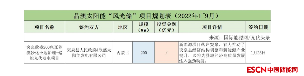 截至2022年9月30日,晶澳太陽能共簽約(規(guī)劃)1個風(fēng)光儲項目,項目規(guī)模為200MW。