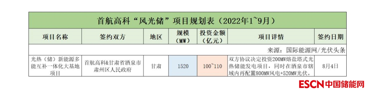 截至2022年9月30日,首航高科共簽約(規(guī)劃)1個風(fēng)光儲項目,項目規(guī)模為1.52GW,投資金額為100~110億元(注:統(tǒng)計時取值110億元)。