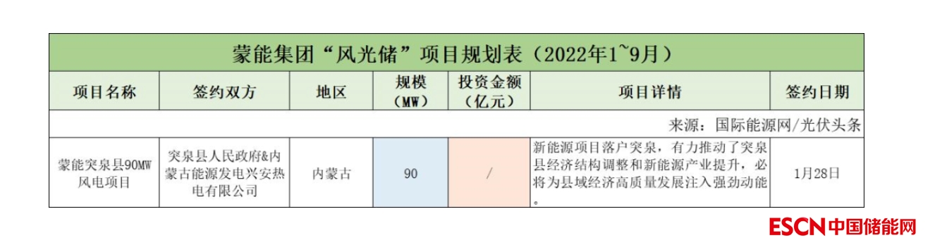截至2022年9月30日,蒙能集團共簽約(規(guī)劃)1個風(fēng)光儲項目,項目規(guī)模為90MW。