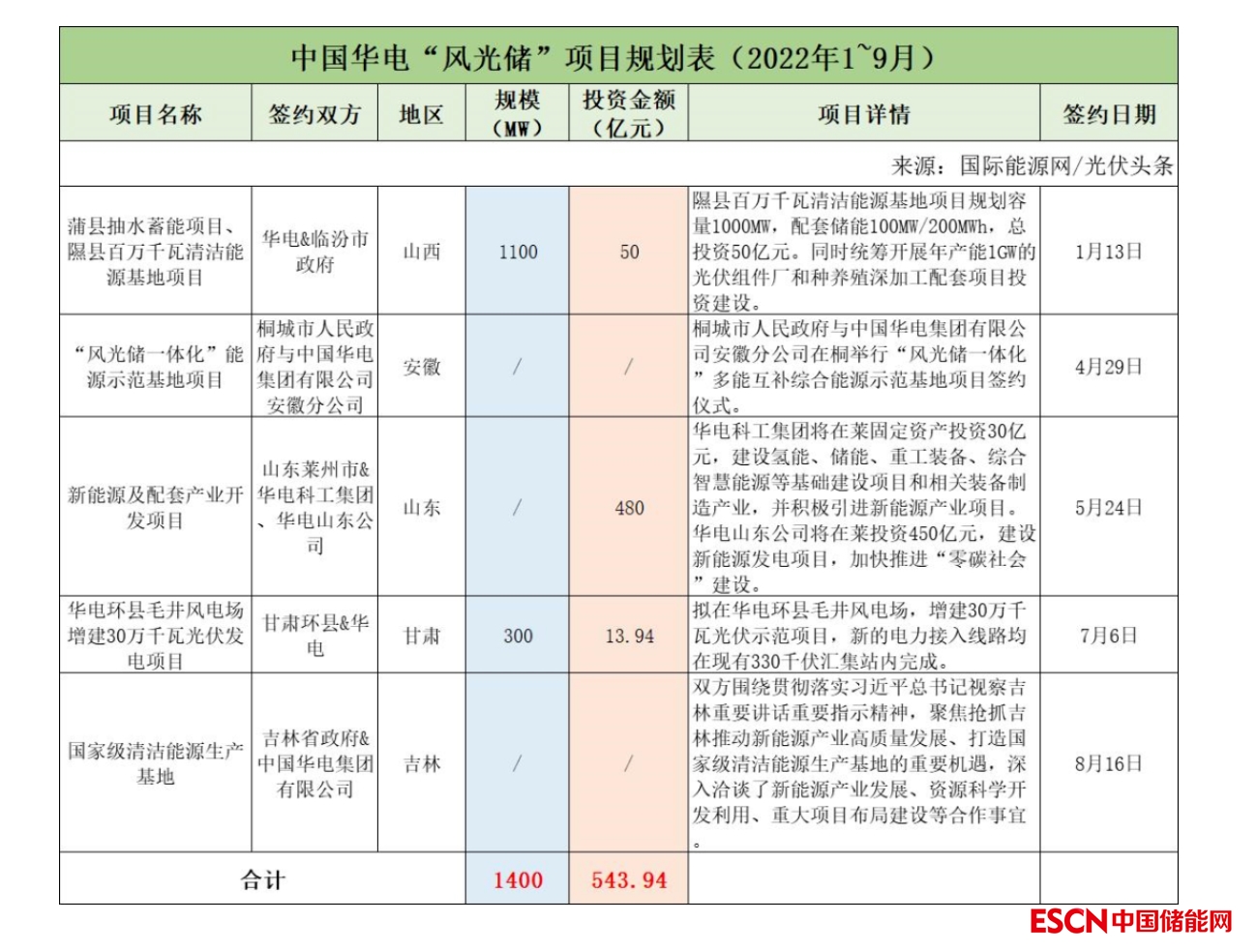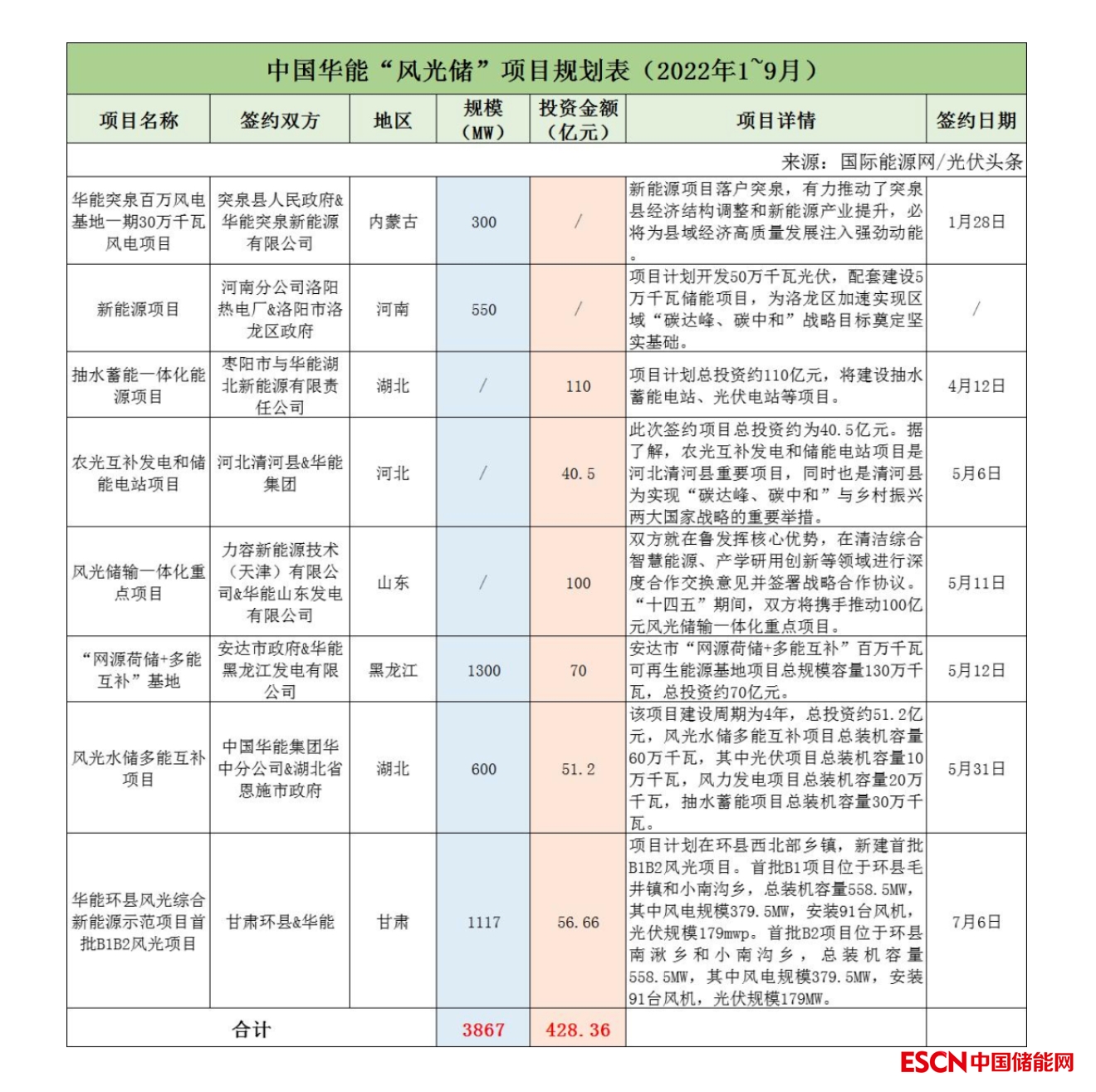 截至2022年9月30日,華能共簽約(規(guī)劃)8個風(fēng)光儲項目,明確規(guī)模共計3.867GW,有6個項目明確投資金額共計428.36億元。