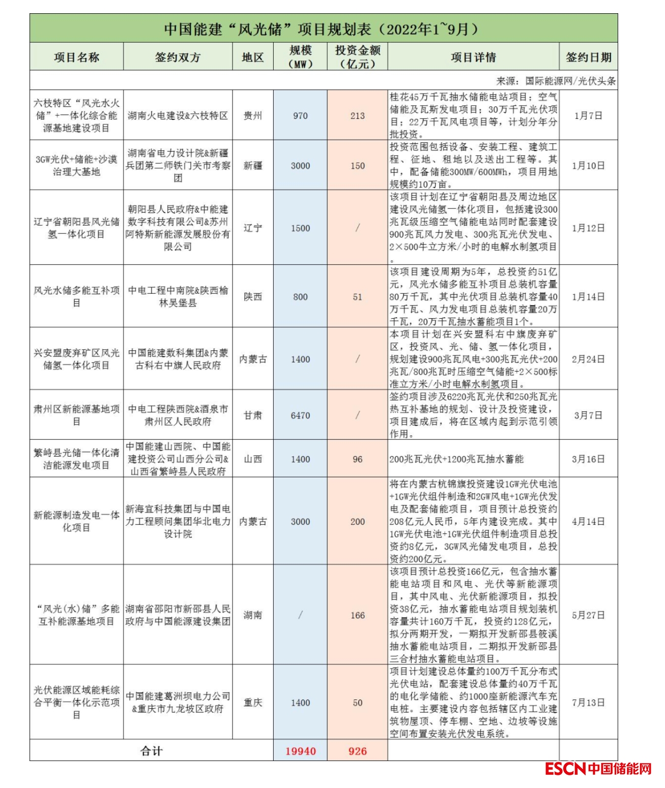 截至2022年9月30日,中國能建共簽約(規(guī)劃)10個風(fēng)光儲項目,明確項目規(guī)模共計19.94GW。此外,有7個項目明確投資金額,共926億元。