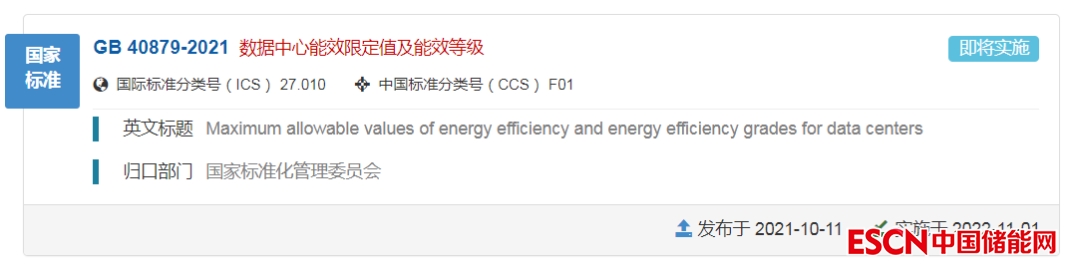 中國儲能網(wǎng)訊:據(jù)國家市場監(jiān)管總局(國家標準化管理委員會)網(wǎng)站消息,國家標準《數(shù)據(jù)中心能效限定值和能效等級》(GB 40879—2021)自2022年11月1日起在全國范圍強制實施。