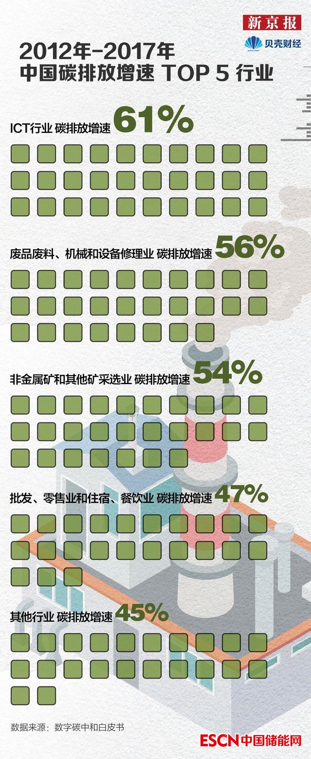 隨著數(shù)字化進程不斷加深,包含數(shù)據(jù)中心、信息通信網(wǎng)絡(luò)等產(chǎn)業(yè)的ICT行業(yè)碳排放快速增長。2012年至2017年,ICT行業(yè)碳排放增長61%,成為漲幅最高的產(chǎn)業(yè),其中數(shù)據(jù)中心和5G基站能耗較快增長。