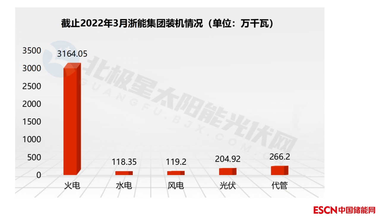 截至 2022 年 3 月,浙能集團控股電力裝機容量 3606.51 萬千瓦,其中火電裝機容量3164.05萬千瓦,水電裝機容量118.35萬千瓦。風電裝機容量119.2萬千瓦,光伏裝機容量204.92萬千瓦,代管裝機容量266.2萬千瓦。