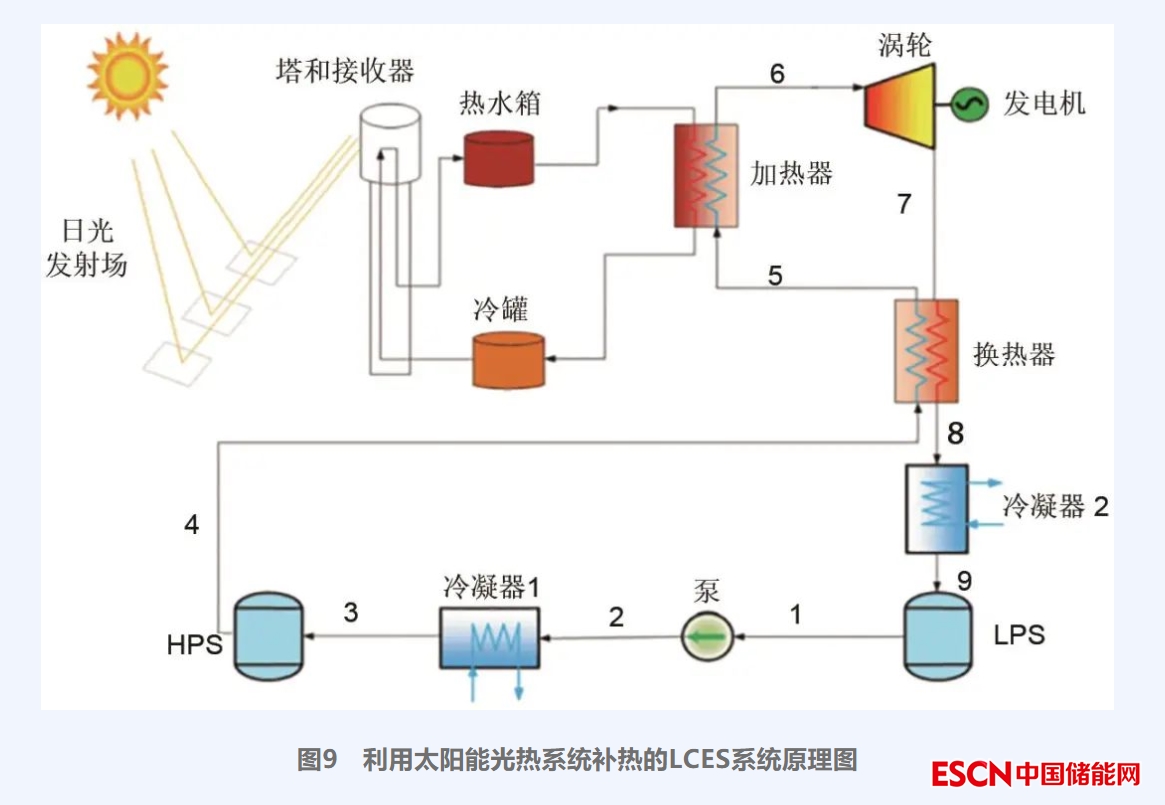 文獻(xiàn)[33]提出了一種利用太陽能光熱系統(tǒng)補(bǔ)熱的LCES系統(tǒng),如圖9所示,該系統(tǒng)在透平入口前引入額外的光熱熱源,在透平出口設(shè)置回?zé)崞骰厥?00 ℃二氧化碳的余熱,從而提高了透平進(jìn)口溫度。與常規(guī)LAES系統(tǒng)相比,該系統(tǒng)具有較高的循環(huán)效率和?效率。但需要注意的是,該系統(tǒng)需要控制太陽熱量的波動(dòng)以減小對(duì)LCES系統(tǒng)透平進(jìn)口溫度穩(wěn)定性的影響。