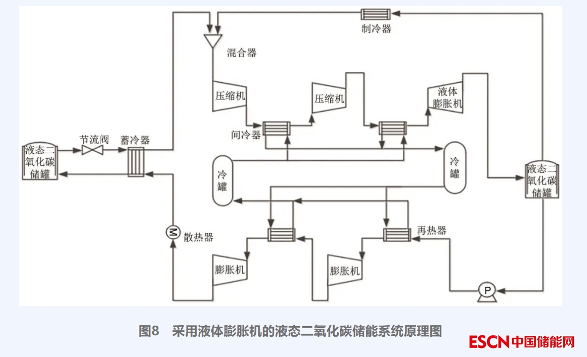 LCES系統(tǒng)在壓縮后也可以采用節(jié)流閥或液體膨脹機(jī)通過節(jié)流效應(yīng)進(jìn)行液化,但由于節(jié)流過程仍有部分CO2不能液化,所以需要配置氣液分離器并將氣態(tài)CO2返回壓縮機(jī)繼續(xù)壓縮液化,這種系統(tǒng)可以避免外設(shè)低溫冷卻系統(tǒng)。吳毅等設(shè)計(jì)的一種采用液態(tài)膨脹機(jī)的液態(tài)二氧化碳儲(chǔ)能系統(tǒng)如圖8所示,該系統(tǒng)在高壓側(cè)的儲(chǔ)能過程和釋能過程分別采用液體膨脹機(jī)和低溫泵控制儲(chǔ)能壓力和釋能壓力。通過熱力學(xué)分析和多目標(biāo)優(yōu)化,發(fā)現(xiàn)該系統(tǒng)最佳釋能壓力為18.3 MPa,最佳儲(chǔ)能壓力為11.7 MPa,對(duì)應(yīng)系統(tǒng)儲(chǔ)能效率為50.4%,儲(chǔ)能密度為21.7 kWh/m3。但由于存在膨脹機(jī)功損失,意味著這個(gè)系統(tǒng)還有很大的改進(jìn)潛力。