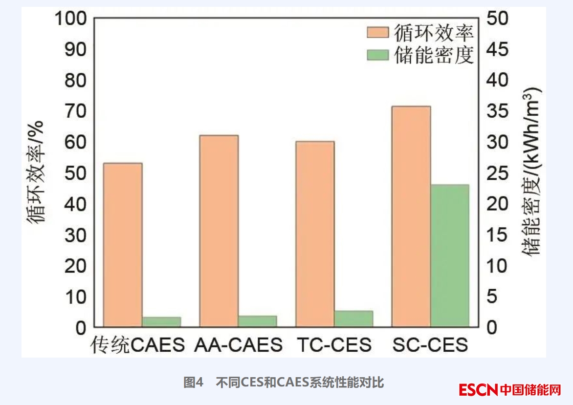 北京大學(xué)Zhang等研究了基于熱水蓄熱的跨臨界和超臨界壓縮二氧化碳儲(chǔ)能系統(tǒng)。如圖3所示,這兩種系統(tǒng)本質(zhì)上沒有區(qū)別,TC-CES系統(tǒng)相較于SC-CES系統(tǒng)另外設(shè)計(jì)了壓縮前預(yù)熱器,目的是使低壓儲(chǔ)罐中的液態(tài)CO2在進(jìn)入壓縮機(jī)前完全氣化,而SC-CES系統(tǒng)低壓儲(chǔ)罐中CO2本身就處于超臨界態(tài),可直接進(jìn)入壓縮機(jī)。研究發(fā)現(xiàn)系統(tǒng)以1 MW釋能功率輸出時(shí),跨臨界運(yùn)行CO2工質(zhì)流量為38.52 kg/s,循環(huán)效率為60%,儲(chǔ)能密度為2.6 kWh/m3;超臨界運(yùn)行CO2工質(zhì)流量為6.89 kg/s,循環(huán)效率為71%,?效率為71.38%,儲(chǔ)能密度為23 kWh/m3。結(jié)合文獻(xiàn)[21-22]的研究結(jié)果,圖4對(duì)比了傳統(tǒng)CAES、AA-CAES、TC-CES和SC-CES系統(tǒng)在釋能功率均為1 MW工況下的循環(huán)效率和能量密度數(shù)據(jù)??梢园l(fā)現(xiàn),TC-CES的循環(huán)效率高于傳統(tǒng)CAES,但略低于AA-CAES,其儲(chǔ)能密度均高于傳統(tǒng)CAES和AA-CAES;而SC-CES的循環(huán)效率最大,且其儲(chǔ)能密度遠(yuǎn)高于其他三種系統(tǒng)。因此,雖然SC-CES比CAES系統(tǒng)額外增加了低壓儲(chǔ)存設(shè)備用于釋能過程中透平存儲(chǔ)出口CO2(對(duì)于SC-CES系統(tǒng)此時(shí)CO2仍處于超臨界態(tài)),但由于其工質(zhì)整體儲(chǔ)存容積需求較低,所以仍具有較高的儲(chǔ)能密度。