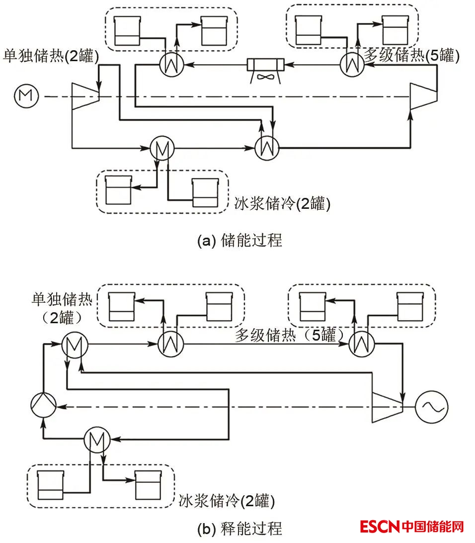 將CO2作為工質(zhì)并應(yīng)用于儲(chǔ)能系統(tǒng)最早是2012年由瑞士洛桑埃爾科爾理工大學(xué)的Morandin教授提出,他設(shè)計(jì)了一種基于熱水蓄熱、冰漿蓄冷的二氧化碳電熱儲(chǔ)能(thermo-electrical carbon dioxide energy storage,TE-CES)系統(tǒng),并基于換熱器網(wǎng)絡(luò)編寫了系統(tǒng)優(yōu)化算法。如圖2所示,該系統(tǒng)的工作原理是:在儲(chǔ)能過程中,電能驅(qū)動(dòng)熱泵系統(tǒng)壓縮機(jī)將CO2壓縮至超臨界態(tài),并將CO2內(nèi)能通過蓄熱罐進(jìn)行儲(chǔ)存,即將電能以熱能形式儲(chǔ)存;在釋能過程中,CO2吸收蓄熱器熱能,再進(jìn)入膨脹機(jī)做功,即將熱能轉(zhuǎn)化為電能輸出。