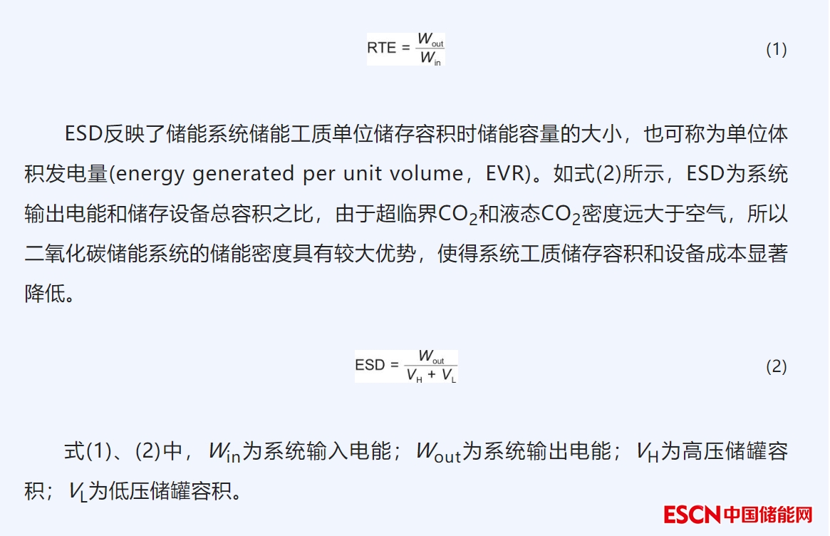 對(duì)于壓縮氣體儲(chǔ)能系統(tǒng),最能反映系統(tǒng)儲(chǔ)能特性的評(píng)價(jià)指標(biāo)主要有系統(tǒng)循環(huán)效率(round trip efficiency,RTE)和儲(chǔ)能密度(energy storage density,ESD)。