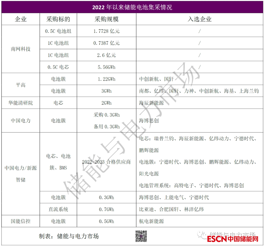 在儲(chǔ)能電芯和電池簇集采方面,南網(wǎng)科技、平高、華能清研院、中國(guó)電力、新源智儲(chǔ)、國(guó)能信控先后啟動(dòng)采購(gòu),并開(kāi)展了儲(chǔ)能系統(tǒng)集成產(chǎn)線的建設(shè)工作,其中共有5家企業(yè)完成了儲(chǔ)能電芯和電池簇的集采,規(guī)模為6.01GWh。