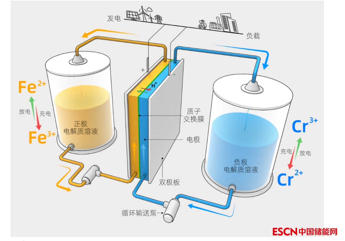鐵-鉻液流電池儲能技術(shù)被稱為儲能時間最長、最安全的電化學儲能技術(shù)之一,該技術(shù)的電解質(zhì)溶液為水系溶液,不會發(fā)生爆炸,可實現(xiàn)功率和容量按需靈活定制,且具有循環(huán)壽命長、穩(wěn)定性好、易回收、運行溫度范圍廣、成本低廉等優(yōu)勢,完全符合我國大規(guī)模、長時間儲能需求的新型電力系統(tǒng)。