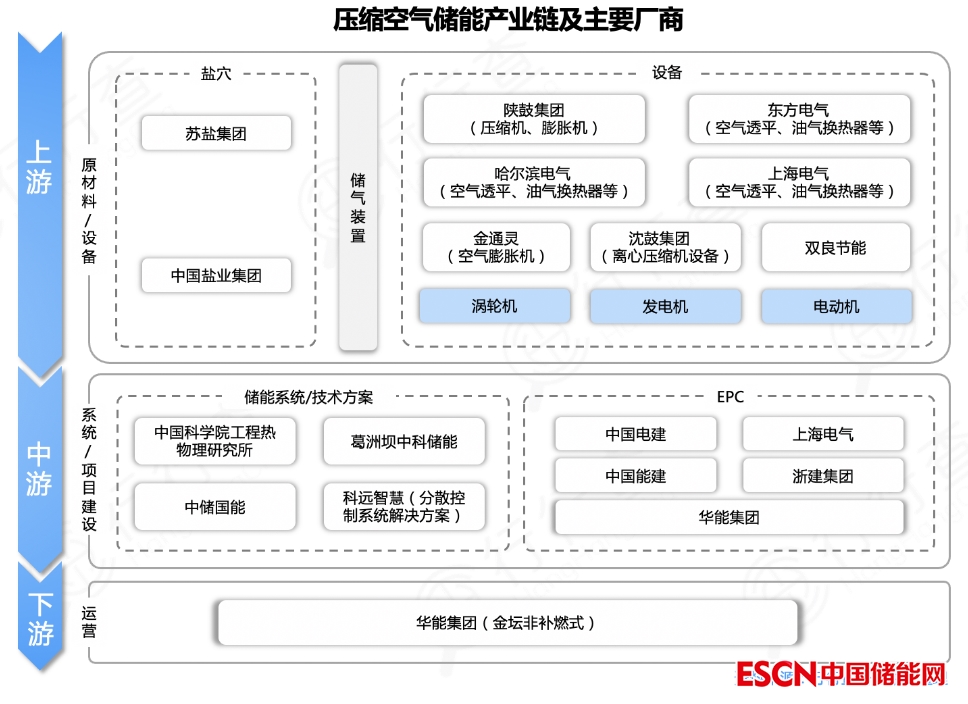 壓縮空氣儲能產(chǎn)業(yè)鏈包括上游裝備制造、儲氣庫;中游儲能系統(tǒng)集成(主要提供技術(shù)支持);下游儲能系統(tǒng)安裝為新能源及傳統(tǒng)電站、電網(wǎng)公司、工商業(yè)企業(yè)等終端用戶提供EPC(工程建設(shè)總承包)業(yè)務(wù)。