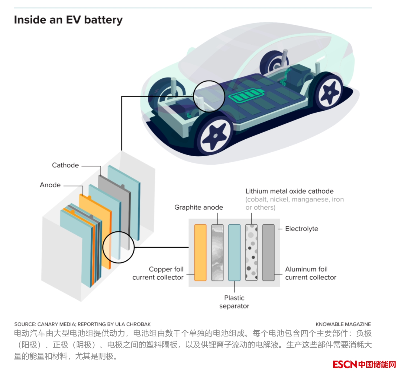 為了給汽車(chē)供電,電池中的電子從負(fù)極(即陽(yáng)極)移動(dòng)到正極(陰極)。通常情況下,陽(yáng)極由銅和石墨制成,而陰極由一類(lèi)稱(chēng)為鋰金屬氧化物的化合物組成,含有鋰以及鈷、錳和鎳等其他金屬。
