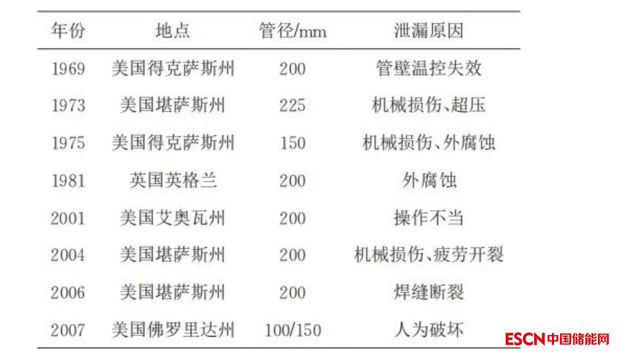 液氨管道常常受到各種內(nèi)外部因素影響,如儲運(yùn)設(shè)備不合格、超壓、老化、腐蝕、操作不當(dāng)、外部撞擊等,導(dǎo)致管道破裂而發(fā)生氨泄漏擴(kuò)散事故。直徑超過 75 mm 的液氨管道泄漏事故大多發(fā)生在美國,且以機(jī)械損傷、人為因素等外部干預(yù)為主(表 6)。除液氨管道外,其他儲氨及運(yùn)氨設(shè)施也可能發(fā)生泄漏事故。2014 年,以色列某工廠因管道遭人為破壞導(dǎo)致儲罐內(nèi)近 8 t 氨氣泄漏,造成 1 人死亡、16 人受傷;2016 年和2018 年,馬來西亞化肥廠及制冰廠先后發(fā)生氨氣泄漏事故,造成多人死亡和受傷;2019 年,美國芝加哥一輛液氨罐車發(fā)生泄漏事故,導(dǎo)致多人受傷而緊急就醫(yī)。綜上,相比油氣泄漏事故,氨氣泄漏事故相對少見,但往往具有突發(fā)性,社會與環(huán)境危害影響大[49-50]。