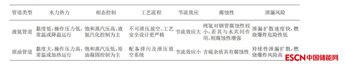 目前,中國的液氨長輸管道主要參照原油長輸管道工藝流程及設(shè)計規(guī)范建造與運(yùn)行[40]。然而,由于液氨與原油理化性質(zhì)的顯著差別,造成液氨管道在水力熱力、相態(tài)控制、工藝流程等方面與傳統(tǒng)輸油管道存在差異(表 3)。在水力熱力方面,液氨的低黏度、低密度特性造成其管道操作壓力低于同管徑原油管道;在相態(tài)控制方面,原油以膠質(zhì)、瀝青質(zhì)存在下的“凝管”現(xiàn)象控制為主,采用常溫或保溫輸送工藝,而液氨以高飽和蒸汽壓特性下的氣化現(xiàn)象控制為主,采用常溫或保冷輸送工藝,同時涉及大落差管道翻越點(diǎn)及事故、放空等工況下的相變問題;在工藝流程方面,由于液氨屬于IV 類輕度危害有毒物質(zhì),液氨管道不能直接采用與原油管道相同的排污及泄壓放空工藝,加之安全性問題,液氨管道與閥門設(shè)計壓力、截斷閥間距以及安全閥配備等級與要求均較原油管道嚴(yán)格;在節(jié)流效應(yīng)方面,不同于輸油管道,液氨管道的強(qiáng)節(jié)流效應(yīng)可能造成投產(chǎn)或事故、放空工況下的凍堵或其他管道損傷問題;在腐蝕性方面,不同于原油管道普遍存在的含硫雜質(zhì)腐蝕現(xiàn)象,純液氨對鋼鐵基本不腐蝕,一般不考慮管道內(nèi)腐蝕問題[40],然而氨易溶于水形成具有較強(qiáng)腐蝕性的氨水,因此,當(dāng)管道含水量異常時,需要對管道減薄、穿孔、泄漏等安全問題進(jìn)行評估;在泄漏風(fēng)險方面,原油管道一般呈現(xiàn)持續(xù)性泄漏擴(kuò)散過程,燃燒爆炸風(fēng)險性高,而液氨泄漏呈現(xiàn)瞬時的快速擴(kuò)散及相變過程,由于氨不屬于易燃易爆介質(zhì)且具有刺激性氣味易被察覺,可及時采取措施以保證氨氣積聚濃度低于其爆炸極限。