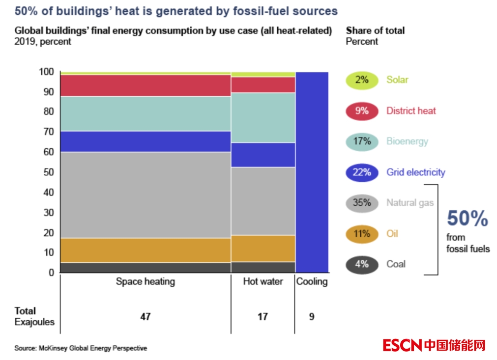 要在2050年實現(xiàn)能源系統(tǒng)的凈零排放目標(biāo),熱能部門的脫碳至關(guān)重要,因為熱能部門的碳排放量目前約占所有能源相關(guān)碳排放的45%。