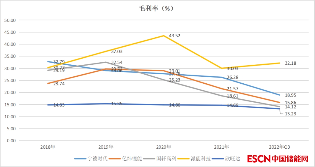 即使是行業(yè)龍頭寧德時(shí)代(300750.SZ)也無法避免,寧德的毛利率已經(jīng)連續(xù)第四年下滑,從2018年的32.79%,下滑至今年三季度的18.95%。(派能科技毛利率逆勢上漲推測主要系人民幣貶值利好出產(chǎn)品出口,派能科技市場主要以海外市場為主,歐洲占比較高。)