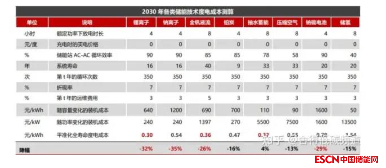 2、到 2030 年,各類儲能技術(shù)的度電成本從低到高排序或依次為:鋰離子電池<抽水蓄能<全釩液流電池<鉛炭電池< 鈉離子電池<壓縮空氣<鈉硫電池<氫儲能。