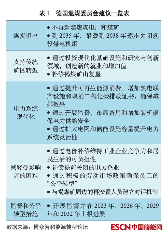 成立退煤委員會(huì)為“退煤”立法提供支持。為有效落實(shí)煤電退出,德國(guó)成立了由礦區(qū)代表、企業(yè)、科研人員、環(huán)境組織、貿(mào)易協(xié)會(huì)等不同利益相關(guān)團(tuán)體組成的退煤委員會(huì),共計(jì)31人,擬定“退煤”提案作為相關(guān)立法的重要參考,內(nèi)容包括煤炭退出、礦區(qū)轉(zhuǎn)型、電力保供、公平轉(zhuǎn)型及監(jiān)督等方面的內(nèi)容(見表 1),并針對(duì)氣電、電價(jià)、 碳市場(chǎng)等附加措施提出建議。例如,退煤委員會(huì)建議允許新建燃?xì)怆姀S作為過渡;氣電替代煤電將加速碳價(jià)和電力批發(fā)價(jià)格上漲,通過經(jīng)濟(jì)補(bǔ)償保持高耗能產(chǎn)業(yè)的競(jìng)爭(zhēng)力、合理控制商業(yè)和居民用電成本負(fù)擔(dān);在碳排放交易體系中(ETS),按照關(guān)停電廠節(jié)省的二氧化碳排放量,成比例削減德國(guó)拍賣的碳配額總量。